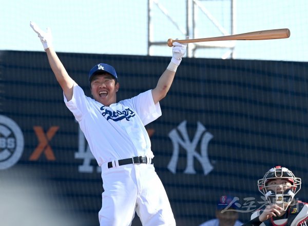 미국 프로야구 메이저리그 베이스볼(MLB)이 주최하는 ‘FTX MLB 홈런더비X 서울’이 17일 인천 파라다이스시티 호텔 컬처파크에서 개최됐다. 시키고 컵스와의 예선전에서 끝내기 홈런을 친 LA 다저스 정근우가 환호하고 있다.