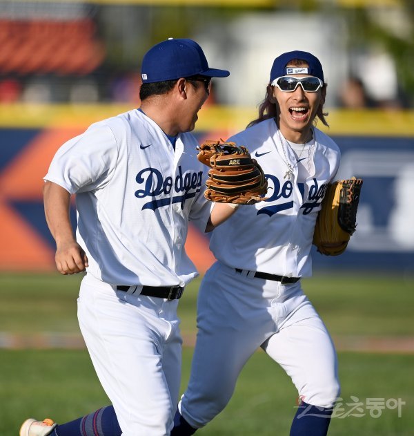 미국 프로야구 메이저리그 베이스볼(MLB)이 주최하는 ‘FTX MLB 홈런더비X 서울’이 17일 인천 파라다이스시티 호텔 컬처파크에서 개최됐다. 결승전에서 LA 다저스 정근우와 곽윤기가 수비를 마친 후 돌아가고 있다.