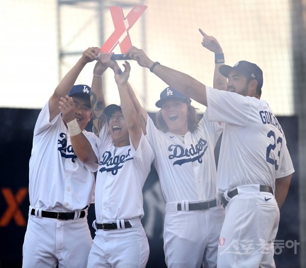 미국 프로야구 메이저리그 베이스볼(MLB)이 주최하는 ‘FTX MLB 홈런더비X 서울’이 17일 인천 파라다이스시티 호텔 컬처파크에서 개최됐다. 우승을 차지한 LA 다저스 정근우, 곽윤기, 애쉬튼 랜스델, 아드리안 곤잘레스가 환호하고 있다.