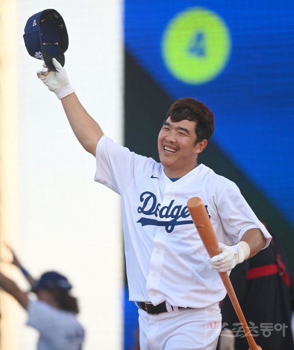 미국 프로야구 메이저리그 베이스볼(MLB)이 주최하는 ‘FTX MLB 홈런더비X 서울’이 17일 인천 파라다이스시티 호텔 컬처파크에서 개최됐다. 결승전에서 LA 다저스 정근우가 타격을 마친 후 웃고 있다.