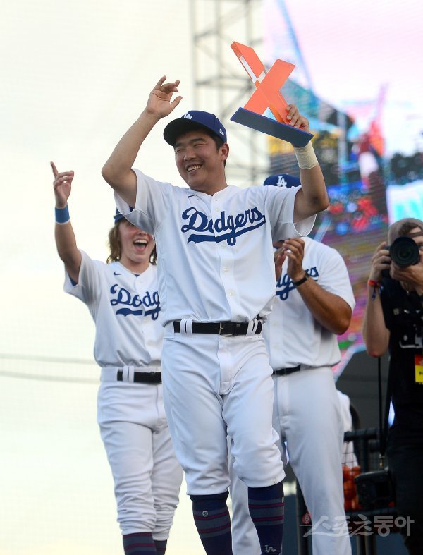 미국 프로야구 메이저리그 베이스볼(MLB)이 주최하는 ‘FTX MLB 홈런더비X 서울’이 17일 인천 파라다이스시티 호텔 컬처파크에서 개최됐다. LA 다저스 정근우가 우승 트로피를 들고 기뻐하고 있다.