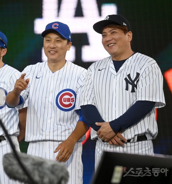 미국 프로야구 메이저리그 베이스볼(MLB)이 주최하는 ‘FTX MLB 홈런더비X 서울’이 17일 인천 파라다이스시티 호텔 컬처파크에서 개최됐다. 시상식에서 이승엽과 김태균이 이야기를 나누고 있다.