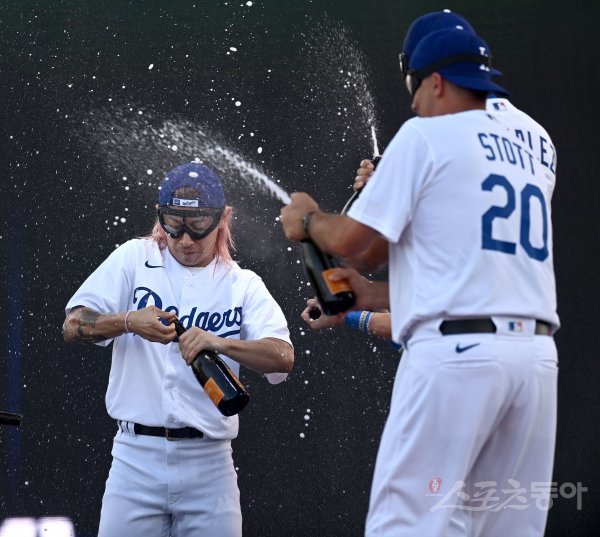 미국 프로야구 메이저리그 베이스볼(MLB)이 주최하는 ‘FTX MLB 홈런더비X 서울’이 17일 인천 파라다이스시티 호텔 컬처파크에서 개최됐다. LA 다저스 곽윤기가 샴페인 뚜경을 못따고 있다.
