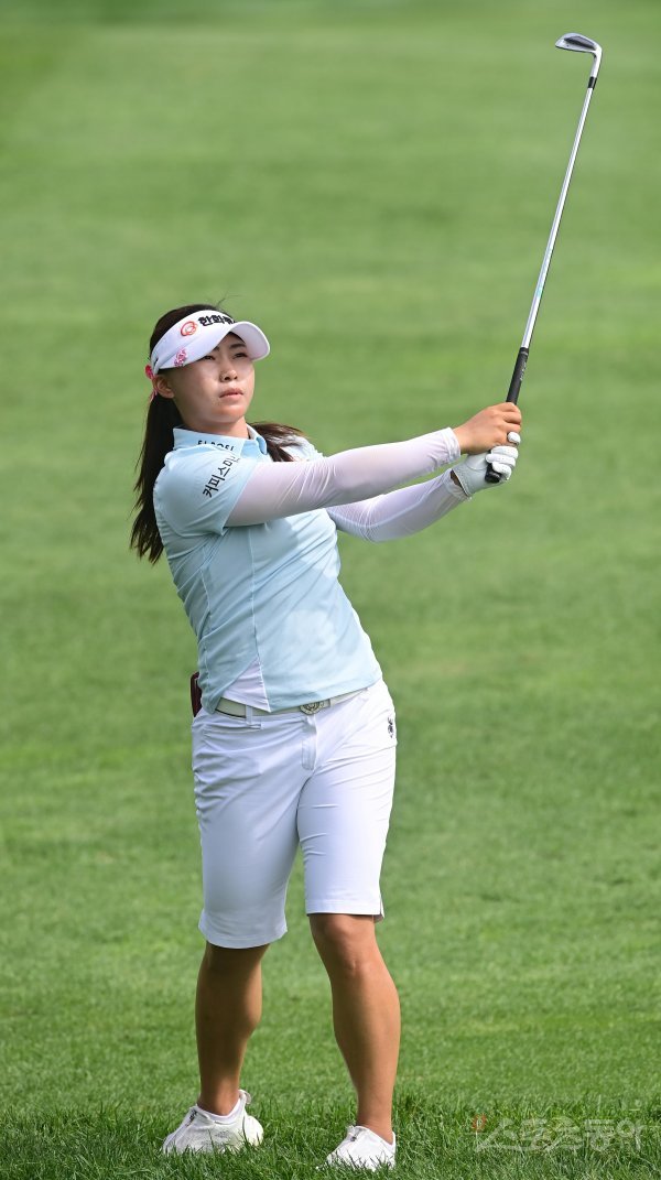 18일 경기 블랙스톤CC 이천에서 열린 KLPGA 투어 ‘KB금융 스타챔피언십’ 4라운드 9번홀에서 김지영2가 세컨샷을 하고 있다.
