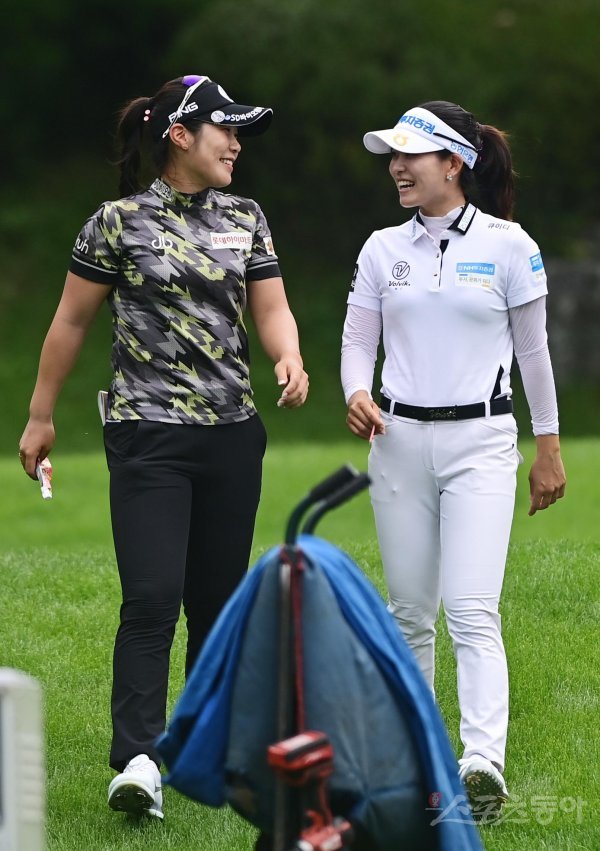 18일 경기 블랙스톤CC 이천에서 열린 KLPGA 투어 ‘KB금융 스타챔피언십’ 4라운드 10번홀에서 티샷을 준비하는 이소영과 박민지가 이야기를 하고 있다.