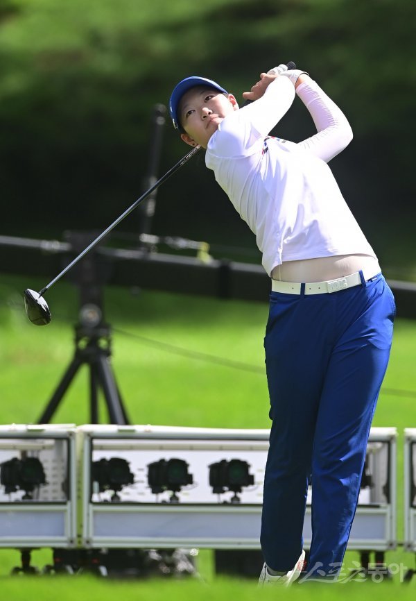 18일 경기 블랙스톤CC 이천에서 열린 KLPGA 투어 ‘KB금융 스타챔피언십’ 4라운드 10번홀에서 방신실이 티샷을 하고 있다.