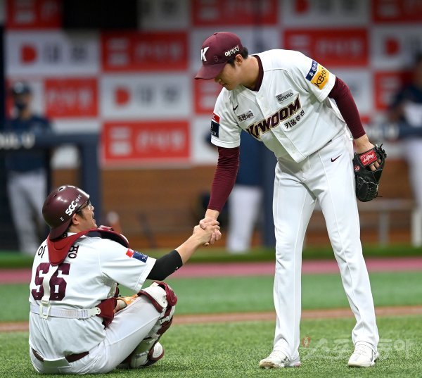 18일 서울 고척스카이돔에서 ‘2022 신한은행 MY CAR KBO리그’ NC 다이노스와 키움 히어로즈 경기가 열렸다. 4회초 무사 NC 기습 번트 때 키움 이지영이 타자주자를 아웃시킨 후 안우진의 도움을 받아 일어나고 있다.