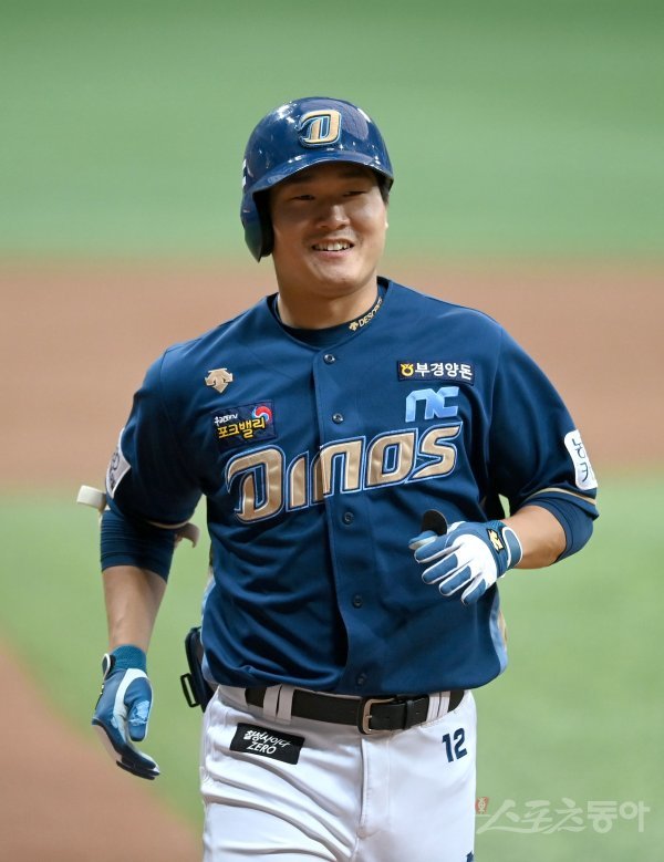 18일 서울 고척스카이돔에서 ‘2022 신한은행 MY CAR KBO리그’ NC 다이노스와 키움 히어로즈 경기가 열렸다. 3회초 1사 2루 NC 정진기가 역전 우월 투런 홈런을 날리고 그라운드를 돌아 홈인해 하이파이브 하고 있다.