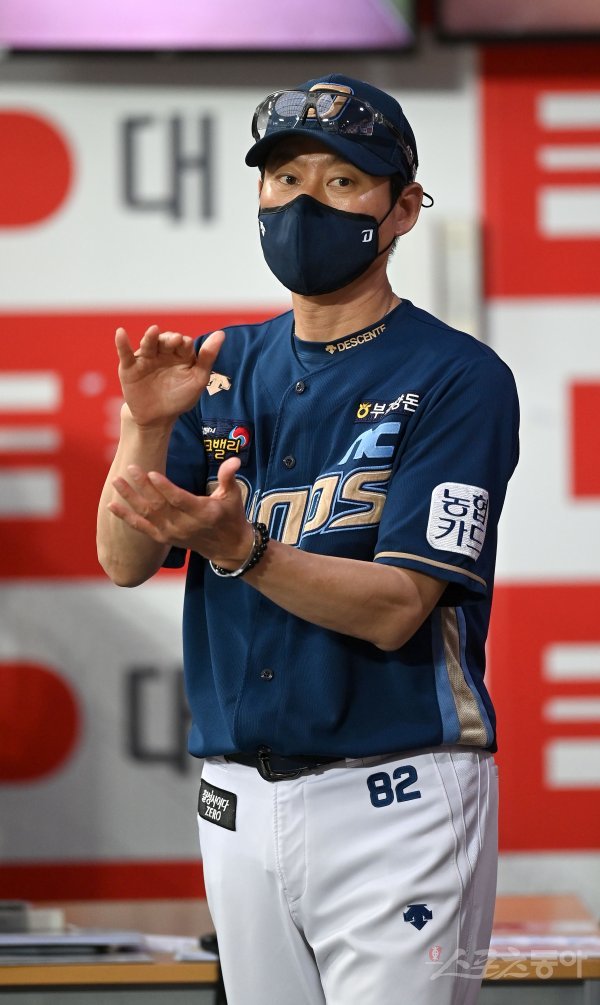 18일 서울 고척스카이돔에서 ‘2022 신한은행 MY CAR KBO리그’ NC 다이노스와 키움 히어로즈 경기가 열렸다. NC 강인권 감독대행이 선수들을 격려하고 있다.