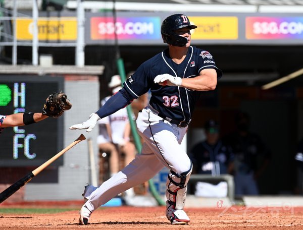 18일 인천 SSG 랜더스필드에서 ‘2022 신한은행 SOL KBO리그’ SSG 랜더스와 두산 베어스의 경기가 열렸다. 2회초 2사 1루에서 두산 김재환이 1타점 2루타를 날리고 있다.