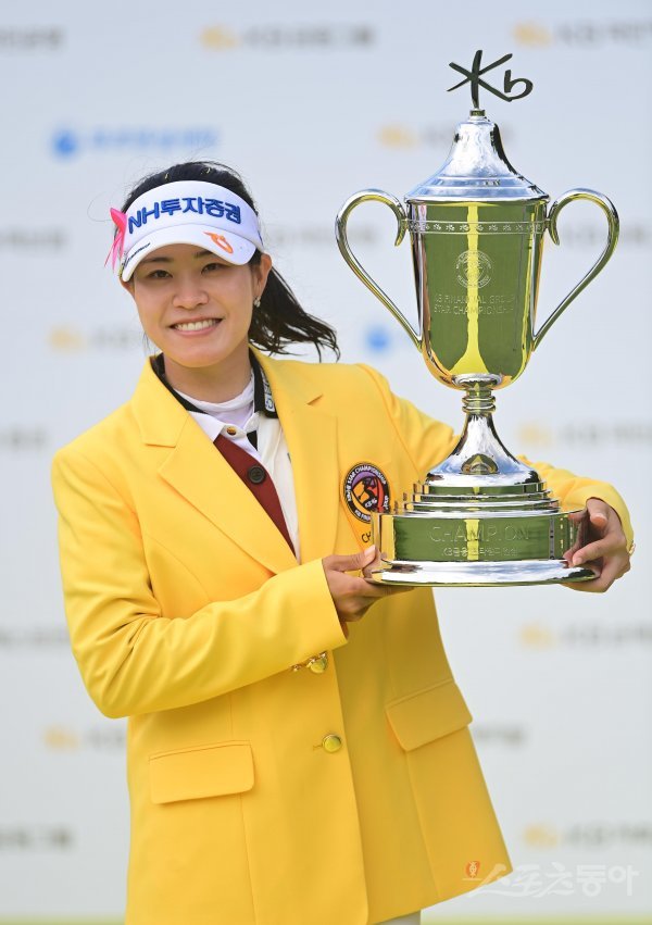 18일 경기 블랙스톤CC 이천에서 열린 KLPGA 투어 ‘KB금융 스타챔피언십’에서 시즌 네 번째 우승을 차지한 박민지가 우승 트로피를 들고 포즈를 취하고 있다.