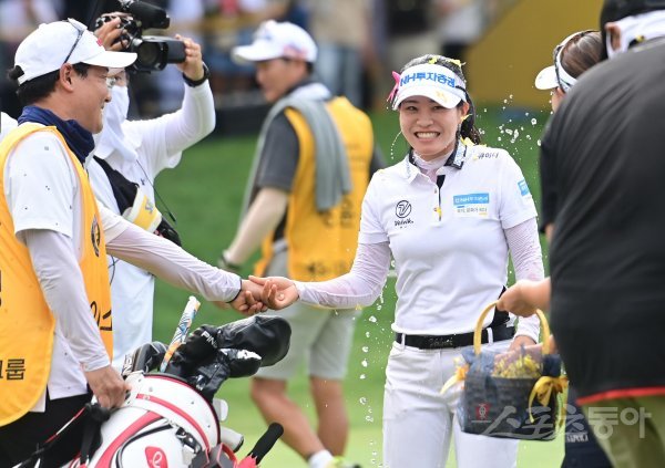 18일 경기 블랙스톤CC 이천에서 열린 KLPGA 투어 ‘KB금융 스타챔피언십’에서 시즌 네 번째 우승을 차지한 박민지가 동료들의 축하를 받고 있다.