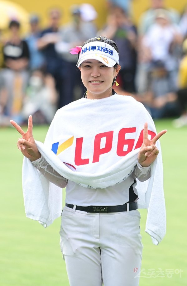 18일 경기 블랙스톤CC 이천에서 열린 KLPGA 투어 ‘KB금융 스타챔피언십’에서 시즌 네 번째 우승을 차지한 박민지가 포즈를 취하고 있다.
