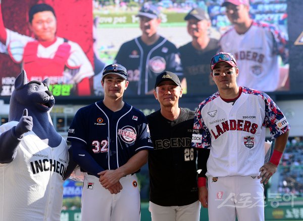 18일 인천 SSG 랜더스필드에서 ‘2022 신한은행 SOL KBO리그’ SSG 랜더스와 두산 베어스의 경기가 열렸다. 클리닝 타임 때 KBO레전드 40인에 선정된 박경완이 시상식에서 두산 김재환, SSG 한유섬과 기념촬영을 하고 있다.