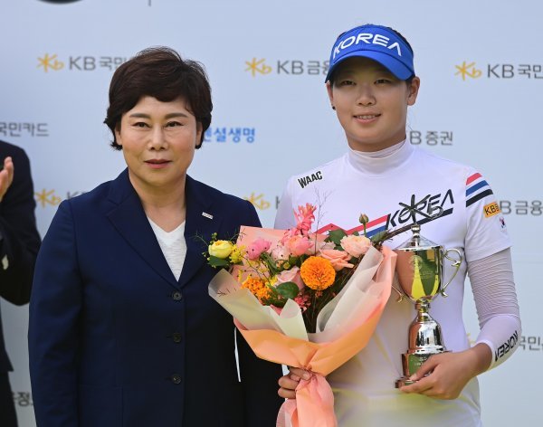18일 경기 블랙스톤CC 이천에서 열린 KLPGA 투어 ‘KB금융 스타챔피언십’에서 방신실이 김순자 KLPGA 수석부회장으로부터 아마추어상을 수상해 기념 촬영을 하고 있다.