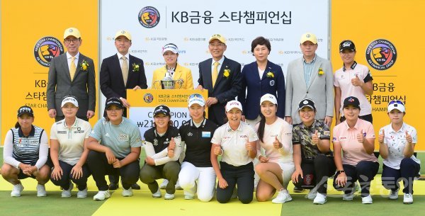 18일 경기 블랙스톤CC 이천에서 열린 KLPGA 투어 ‘KB금융 스타챔피언십’에서 시즌 네 번째 우승을 차지한 박민지가 우승 트로피를 받아 윤종권 KB금융 회장, 김순미 KLPGA 수석부회장 및 동료들과 기념 촬영을 하고 있다.