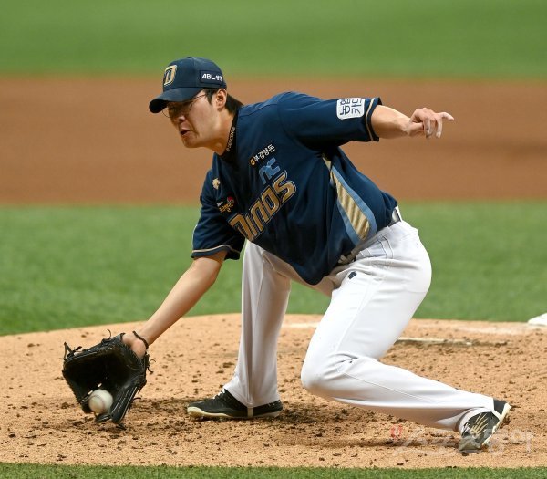18일 서울 고척스카이돔에서 ‘2022 신한은행 MY CAR KBO리그’ NC 다이노스와 키움 히어로즈 경기가 열렸다. 6회말 1사 2루 NC 김영규가 직선타를 잡아 병살 처리하고 있다.