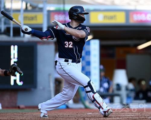 18일 인천 SSG 랜더스필드에서 ‘2022 신한은행 SOL KBO리그’ SSG 랜더스와 두산 베어스의 경기가 열렸다. 7회초 1사에서 두산 김재환이 안타를 날리고 있다.