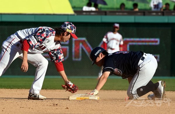 18일 인천 SSG 랜더스필드에서 ‘2022 신한은행 SOL KBO리그’ SSG 랜더스와 두산 베어스의 경기가 열렸다. 8회초 2사 1루에서 두산 정수빈이 2루 도루를 성공시키고 있다.