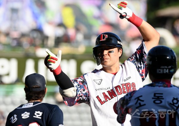 18일 인천 SSG 랜더스필드에서 ‘2022 신한은행 SOL KBO리그’ SSG 랜더스와 두산 베어스의 경기가 열렸다. 7회말 무사 만루에서 SSG 한유섬이 1타점 적시타를 날린 후 세리머니를 펼치고 있다.