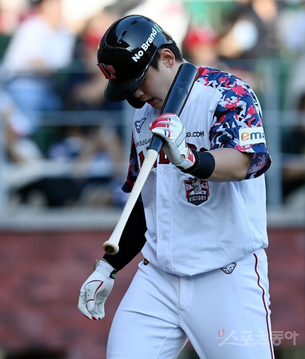 18일 인천 SSG 랜더스필드에서 ‘2022 신한은행 SOL KBO리그’ SSG 랜더스와 두산 베어스의 경기가 열렸다. 7회말 2사 1, 3루에서 SSG 전의산이 삼진 아웃으로 물러나고 있다.