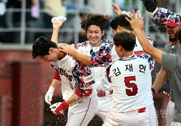 18일 인천 SSG 랜더스필드에서 ‘2022 신한은행 SOL KBO리그’ SSG 랜더스와 두산 베어스의 경기가 열렸다. 9회말 1사에서 SSG 오태곤이 끝내기 홈런을 쏘아 올린 후 동료들의 몰세례를 받고 있다.