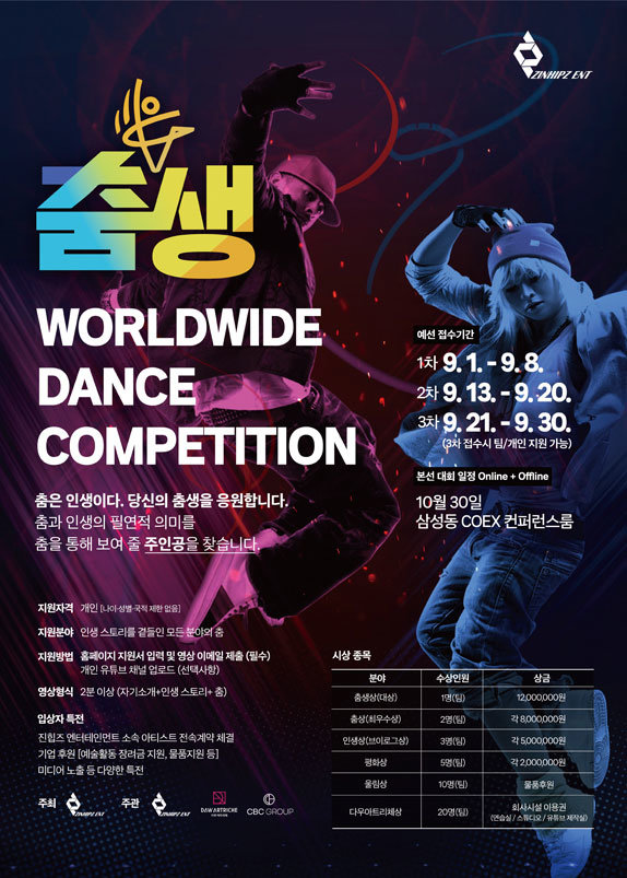 국내 최초 댄스 전문 매니지먼트사 진힙즈엔터테인먼트(회장 김동신)가 주최하는 ‘춤생’은 9월 1일부터 예선 참가 접수를 시작, 오는 20일까지 2차 접수가 진행 중인 가운데 10월 30일(일) 서울 삼성동 코엑스 컨퍼런스룸 특별무대에서 본선대회를 개최한다.