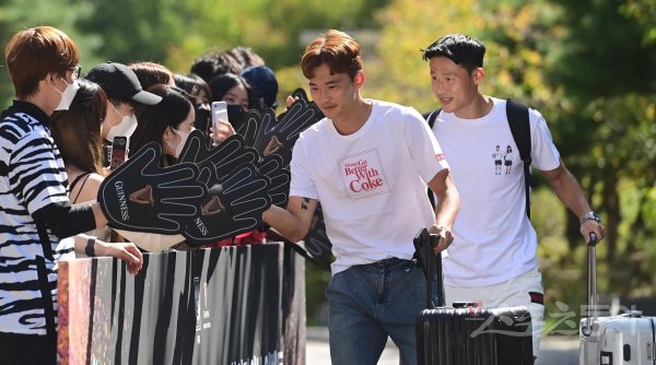 한국축구대표팀이 19일 경기도 파주 축구대표팀트레이닝센터(NFC)에서 코스타리카, 카메룬과 친선경기에 앞서 소집훈련을 진행했다. 김진수와 손준호가 팬들과 하이파이브를 하고 있다.