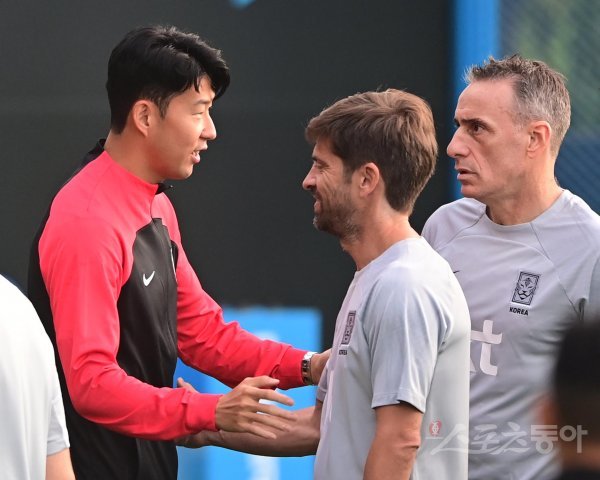 한국축구대표팀이 19일 경기도 파주 축구대표팀트레이닝센터(NFC)에서 코스타리카, 카메룬과 친선경기에 앞서 소집훈련을 진행했다. 손흥민과 파울루 벤투 감독이 인사하고 있다.