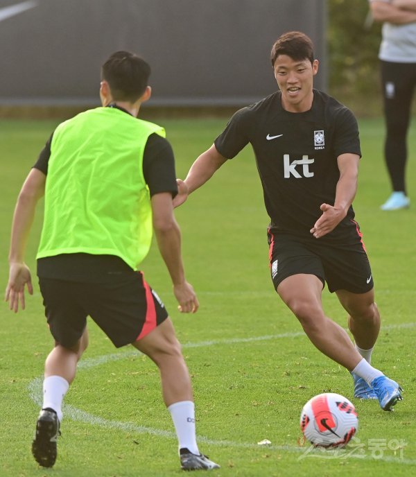 한국축구대표팀이 19일 경기도 파주 축구대표팀트레이닝센터(NFC)에서 코스타리카, 카메룬과 친선경기에 앞서 소집훈련을 진행했다. 황희찬이 훈련을 하고 있다.