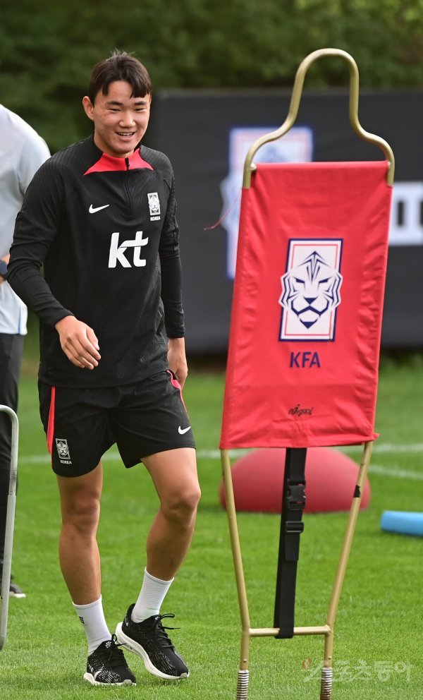 한국축구대표팀이 19일 경기도 파주 축구대표팀트레이닝센터(NFC)에서 코스타리카, 카메룬과 친선경기에 앞서 소집훈련을 진행했다. 양현준이 워밍업을 하고 있다.
