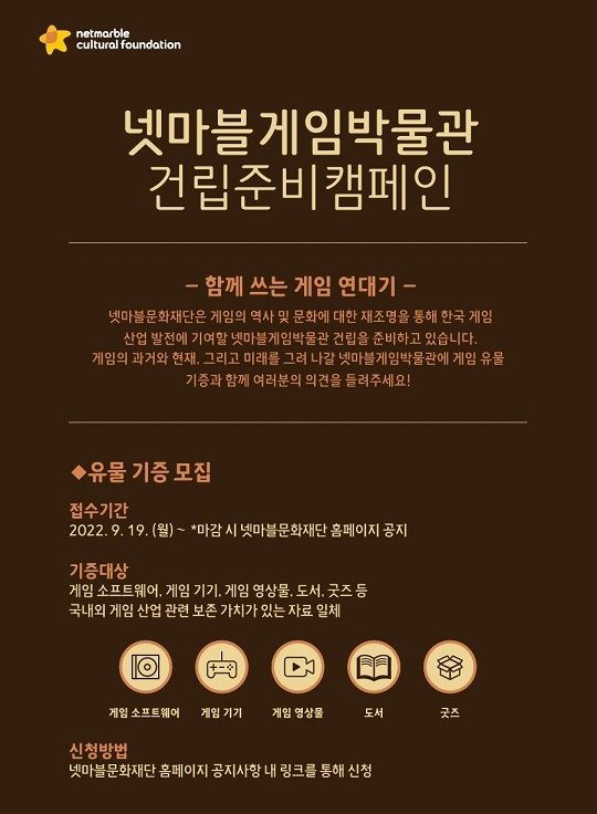 넷마블문화재단은 넷마블게임박물관 건립에 앞서 유물 기증 캠페인을 실시한다고 19일 밝혔다. 재단은 게임의 역사 및 문화에 대한 재조명을 통해 한국 게임산업의 발전에 기여하고 문화적 가치를 높이기 위해 내년 하반기 지타워에 넷마블게임박물관을 건립할 예정이다. 이번 캠페인의 기증 대상은 게임 소프트웨어, 게임기기, 게임 영상물, 도서, 굿즈 등 국내외 게임 산업 관련 보존 가치가 있는 자료 일체로, 유물 및 자료 기증을 희망하는 개인·단체 누구나 참여할 수 있다. 재단 홈페이지 공지사항 내 링크를 통해 신청 접수 후 적합 평가 및 심의위원회의 유물 감정 결과에 따라 유물 인수가 진행된다. 기증자에게는 기증증서 발급 및 유물 전시시 기증자 표기 등의 예우가 주어진다.