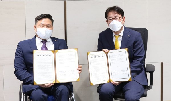이재근 KB국민은행장(오른쪽)과 조향현 한국장애인고용공단 이사장. 사진제공 l KB국민은행