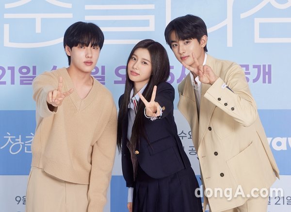 배우 윤현수, 강혜원, 김민규가 20일 오전 진행된 웨이브 오리지널 드라마 ‘청춘블라썸’ 온라인 제작발표회에서 포토타임에 임하고 있다.