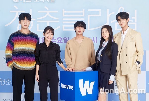 배우 서지훈, 소주연, 김민규, 강혜원, 윤현수가 20일 오전 진행된 웨이브 오리지널 드라마 ‘청춘블라썸’ 온라인 제작발표회에서 포토타임에 임하고 있다.