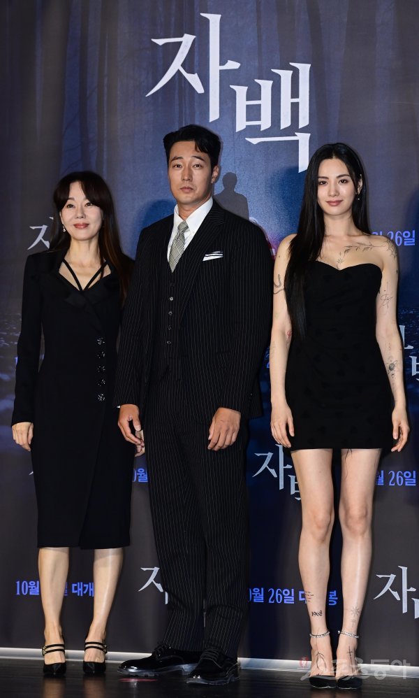 배우 김윤진, 소지섭, 나나가 20일 서울 광진구 자양동 롯데시네마 건대입구점에서 열린 영화 ‘자백’ 제작보고회에서 포즈를 취하고 있다.