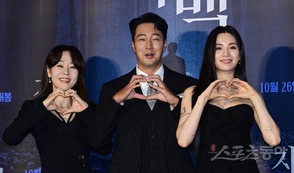 배우 김윤진, 소지섭, 나나가 20일 서울 광진구 자양동 롯데시네마 건대입구점에서 열린 영화 ‘자백’ 제작보고회에서 포즈를 취하고 있다.