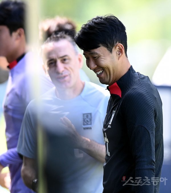 코스타리카, 카메룬과 평가전을 앞둔 한국축구국가대표팀이 20일 경기도 파주 축구대표팀트레이닝센터(NFC)에서 훈련을 가졌다. 축구대표팀 손흥민이 벤투 감독과 이야기도중 미소를 짓고 있다.