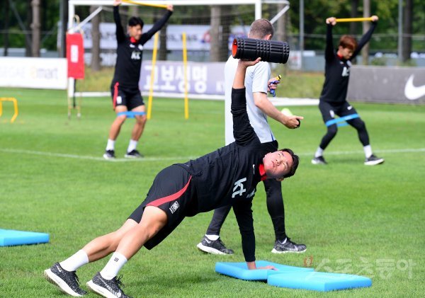 코스타리카, 카메룬과 평가전을 앞둔 한국축구국가대표팀이 20일 경기도 파주 축구대표팀트레이닝센터(NFC)에서 훈련을 가졌다. 축구대표팀 양현준 스트레칭 훈련을 펼치고 있다.