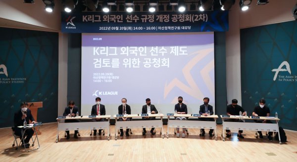 제2차 ‘K리그 외국인선수 제도 개정을 위한 공청회’가 20일 서울시 종로구 아산정책연구원에서 열렸다. 2023~2024시즌 AFC 챔피언스리그(ACL)부터 외국인선수 쿼터가 기존의 ‘3+1’에서 ‘5+1’(국적 무관 5명, AFC 가맹국 1명)로 확대됨에 따라 K리그도 깊은 고민에 빠졌다.