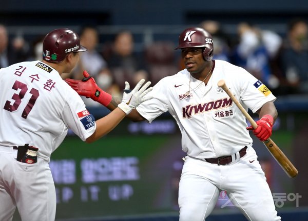 20일 서울 고척스카이돔에서 ‘2022 신한은행 MY CAR KBO리그’ 삼성 라이온즈와 키움 히어로즈 경기가 열렸다. 4회말 2사 키움 푸이그가 좌중월 솔로 홈런을 날리고 그라운드를 돌아 홈인해 기뻐하고 있다.