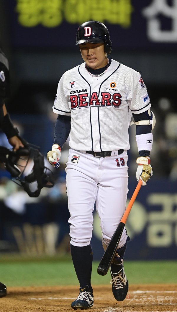 20일 서울 잠실야구장에서 열린 ‘2022 신한은행 SOL KBO리그’ 두산 베어스와 NC 다이노스의 경기에서 3회말 무사 두산 허경민이 투구된 볼에 맞은 후 고통을 참고 있다.