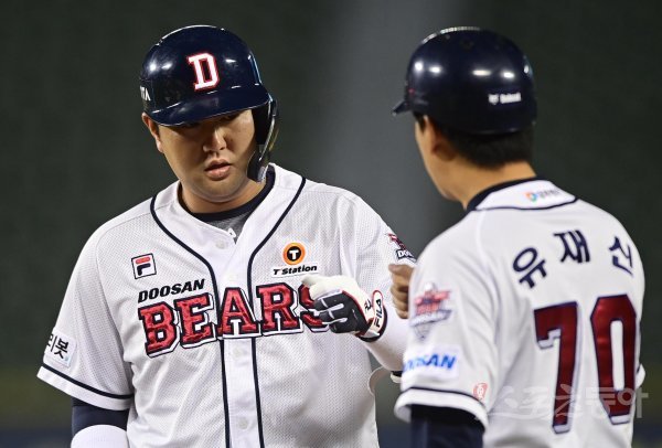 20일 서울 잠실야구장에서 열린 ‘2022 신한은행 SOL KBO리그’ 두산 베어스와 NC 다이노스의 경기에서 2회말 1사 1, 2루 두산 장승현이 1타점 중전 적시타를 친 후 1루코치와 주먹을 맞대고 있다.