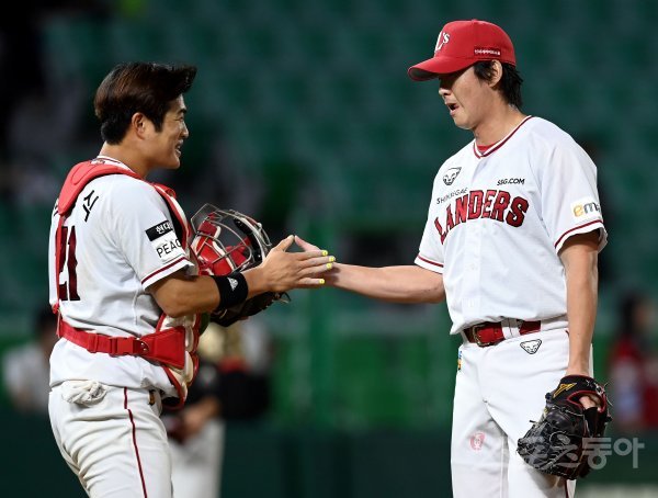 20일 인천 SSG 랜더스필드에서 ‘2022 신한은행 SOL KBO리그’ SSG 랜더스와 kt 위즈의 경기가 열렸다. SSG가 kt를 상대로 4-2로 승리한 후 김민식과 문승원이 기쁨을 나누고 있다.