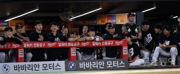 20일 인천 SSG 랜더스필드에서 ‘2022 신한은행 SOL KBO리그’ SSG 랜더스와 kt 위즈의 경기가 열렸다. 2-4로 뒤진 9회초 kt 마지막 공격 때 선수들이 더그아웃에서 경기를 지켜보고 있다.