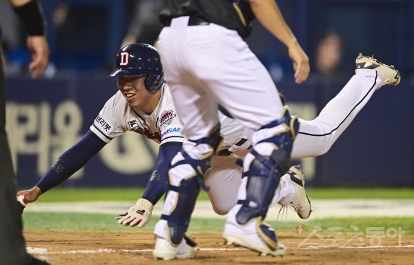 20일 서울 잠실야구장에서 열린 ‘2022 신한은행 SOL KBO리그’ 두산 베어스와 NC 다이노스의 경기에서 7회말 1사 만루 두산의 적시타 때 2루주자 권민석이 홈으로 파고들어 득점에 성공하고 있다.
