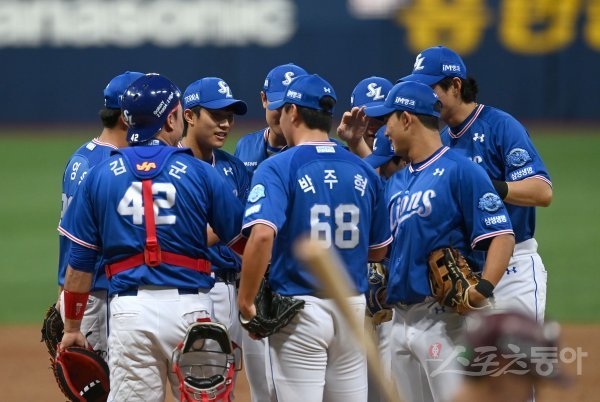 20일 서울 고척스카이돔에서 ‘2022 신한은행 MY CAR KBO리그’ 삼성 라이온즈와 키움 히어로즈 경기가 열렸다. 10-2 승리를 거둔 후 삼성 선수들이 하이파이브 하고 있다.