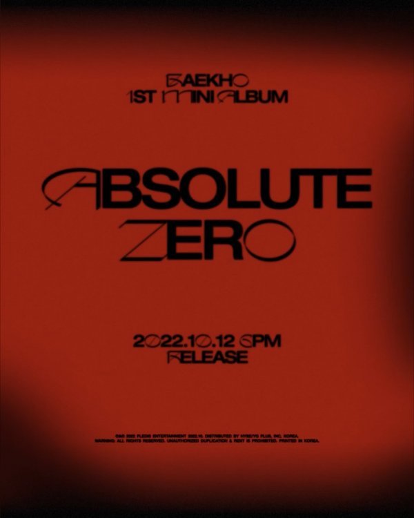 공개된 티저 이미지에는 붉은 배경에 검정색 타이포로 앨범명 ‘Absolute Zero’와 발매 일자 ‘2022.10.12 6PM’이 적혀 있어 시선을 집중시킨다. 뜨거움이 느껴지는 배경에 마치 그을린 듯한 모습과 반복되는 라인은 첫 솔로 데뷔를 앞두고 있는 백호의 앨범이 어떤 메시지를 담고 있는지 궁금증을 높인다.