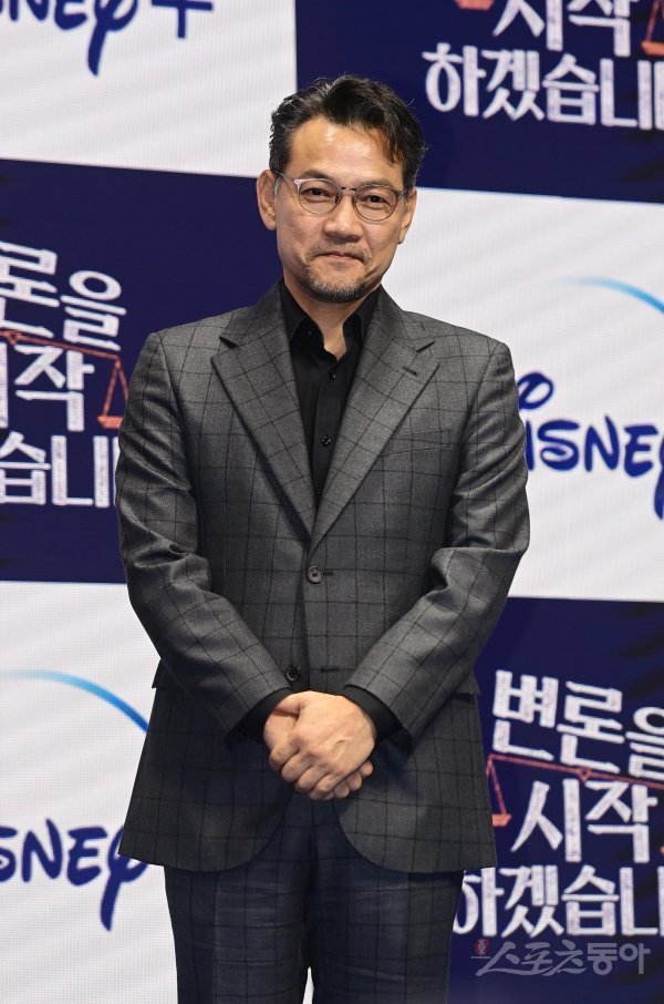 배우 정진영이 21일 서울 중구 소공동 웨스틴조선 서울에서 열린 디즈니플러스 시리즈 ‘변론을 시작하겠습니다’ 제작발표회에서 포즈를 취하고 있다.