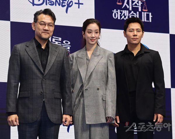 배우 정진영, 정려원, 이규형이 21일 서울 중구 소공동 웨스틴조선 서울에서 열린 디즈니플러스 시리즈 ‘변론을 시작하겠습니다’ 제작발표회에서 포즈를 취하고 있다.